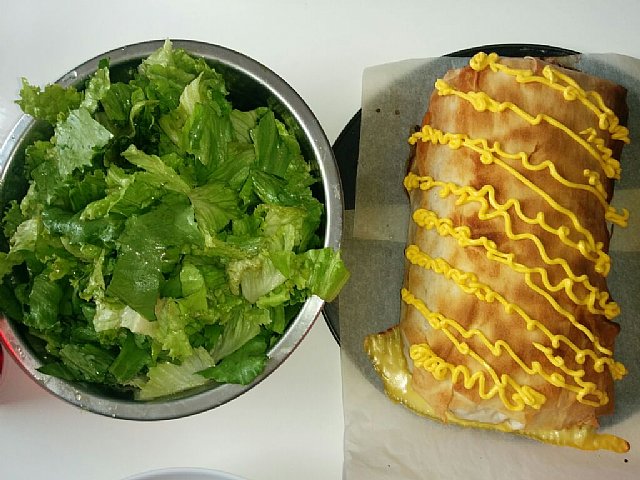 Danes: prszeno meso in cvetača, mozzarella in jajce kot zvitek v vlečenem testu, dodatek nacho sir, zelena solata, radler in kava ![]()