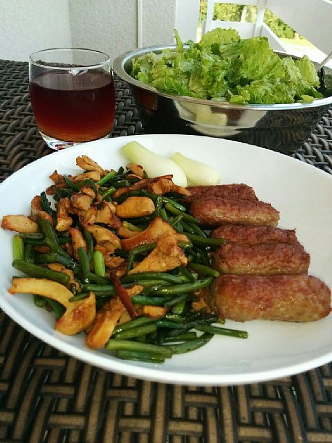 Danes pa praženi pski z lisičkami, čevapčiči, čebula, zelena solata in za odžejati fanta skupaj z Sangrio ![]()