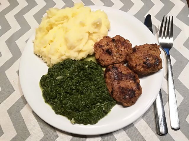 danes špinača na česnu, pire in mesni polpetki