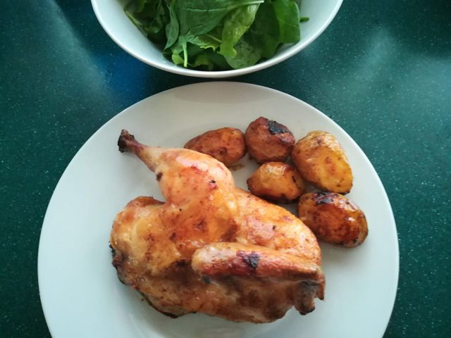 danes polovica pečenega piščanca, za moža še zraven pečen krompir, zelena solata z mlado špinačo in jajčkom