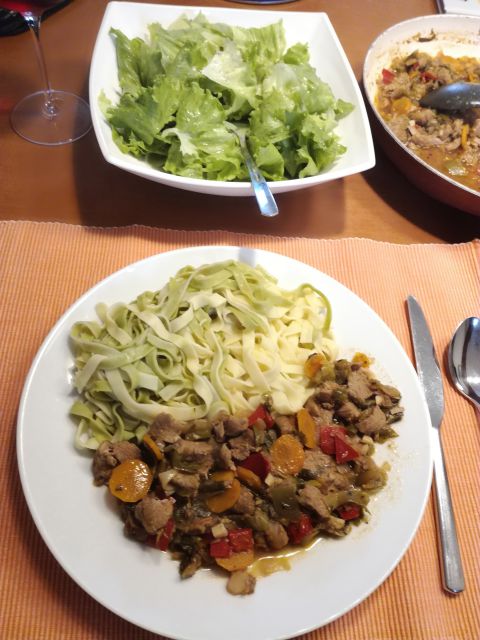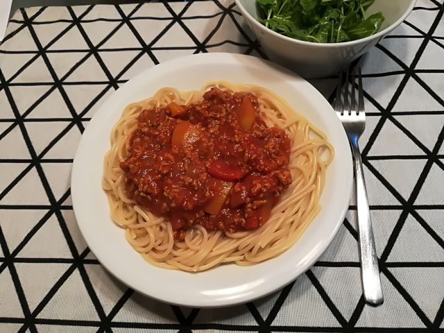danes in jutri špageti, mesna omaka s papriko in rukola v solati