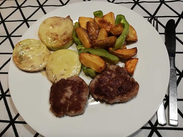 danes polpeti, pečen krompir s papriko in popečene bučke s sirom