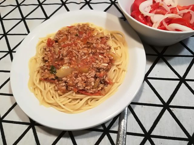 danes in jutri mesna omaka iz svežega paradižnika s papriko, baziliko in feferonom, špageti in spet paradižnikova solata (joj, kako dobri so letos paradižniki)