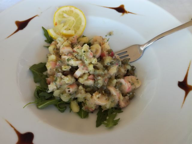 Zame hobotnica s krompirjem in kaprami na posteljici rukole. Odlično. Zraven vroči kruhki iz pica testa....