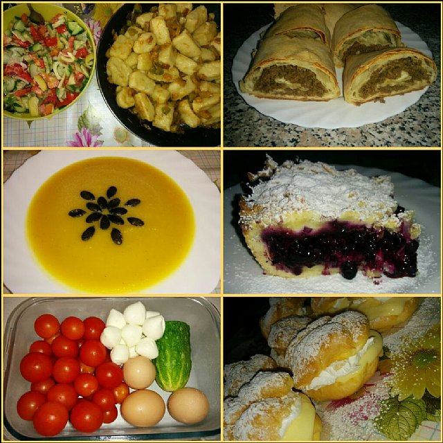 Jaz sem v soboto prepražila na kocke narezano bučko, dodala kuhanje njoke lastne izdelave, poleg solata iz paradižnika in kumar. Sladica borovničeva pita, sladoled in kasneje