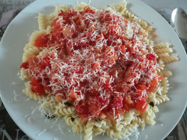 Danes bom kuhala ratatuj omako, paradižnikovo za shranke in bo s testeninami za kosilo. Zraven domač stročji fižol v solati.