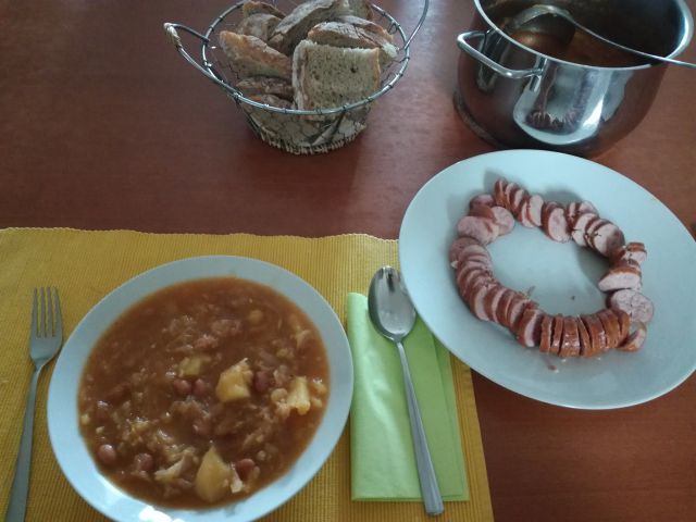 Danes jota s kranjsko klobaso Arvaj, domač kruh.
