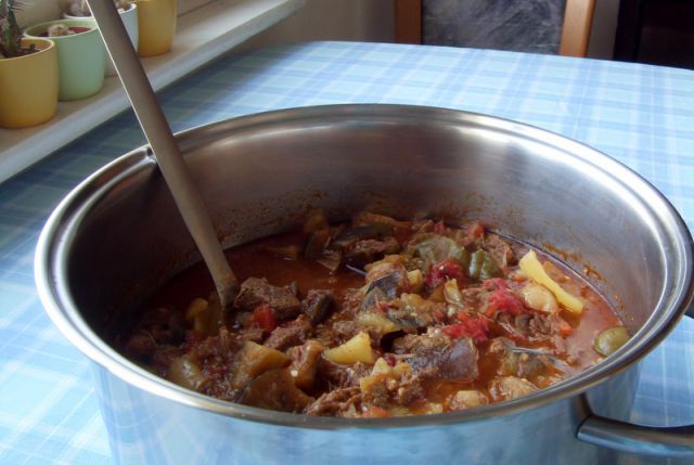 golaž, zdušen včeraj zvečer (1/2 gre v zamrzovalnik), žganci in solata. Ničkaj poletno kosilo, ampak