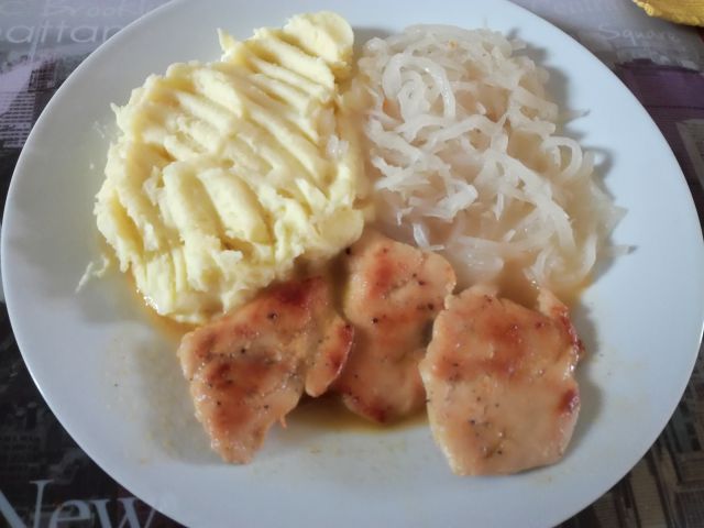 Pri nas danes prva letošnja kisla repa ( kupljena, božanska), pire krompir, popečeni naravni zrezki
