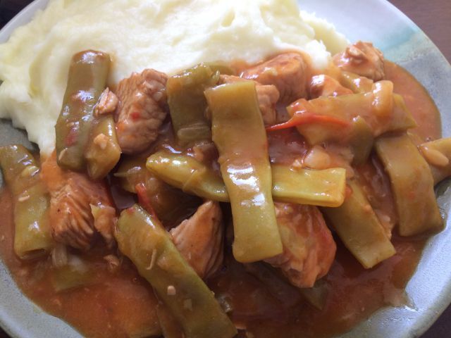 pire krompir in ˝golaž˝ iz puranjega mesa in stročjega fižola