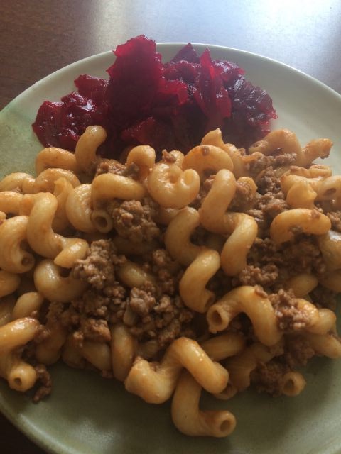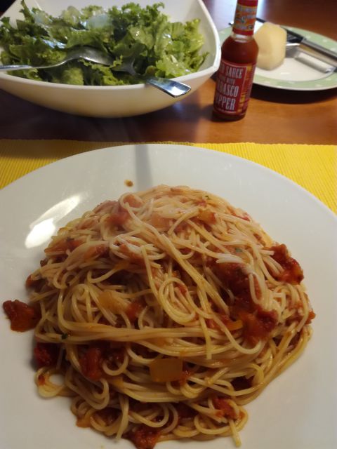 Vceraj sva jedla neposrecen sataras, danes pa makaronflajs in rdeco peso.