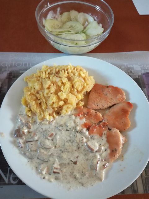 Danes popečeni zrezki, pražen krompir in čisto sveže nabrani jurčki v omaki, kumarična solata.