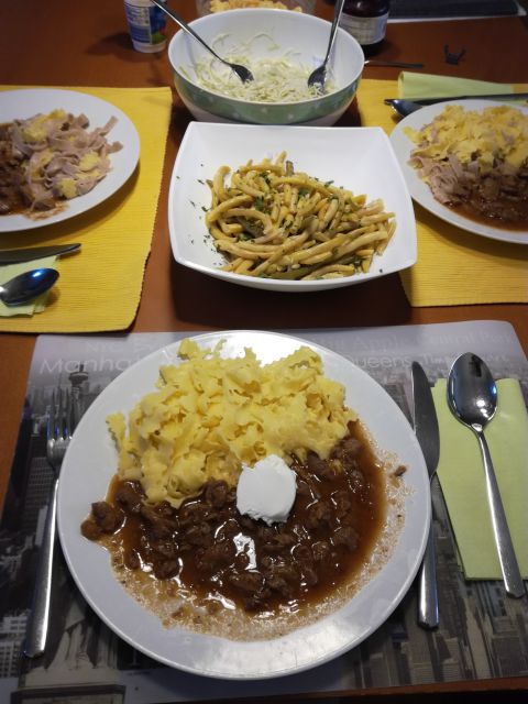 Danes teletina v omaki, široki rezanci ( navadni, pirini), domač stročji fižol v solati, zeljna solata, krompirjeva solata ( je včeraj ostal krompir)