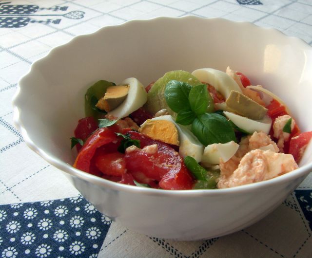 in ješprenjeva solata z ostanki včerajšnjih hrenovk, paprike, čebule, paradižnika, oliv...oplemenitena z olivnim oljem, polnim bazilikinih cvetov (podarjeno, prvič probala, odlično)