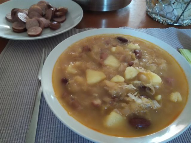 Mineštra z svežim zeljem, pašta z golažem, ki se je kuhal tri ure, solata.![]()
