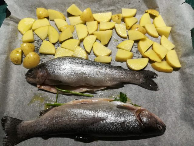 Tudi pri nama ribe - postrvi, pečen krompir in tržaška omaka (slikica pred peko, potem ni časa