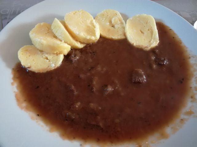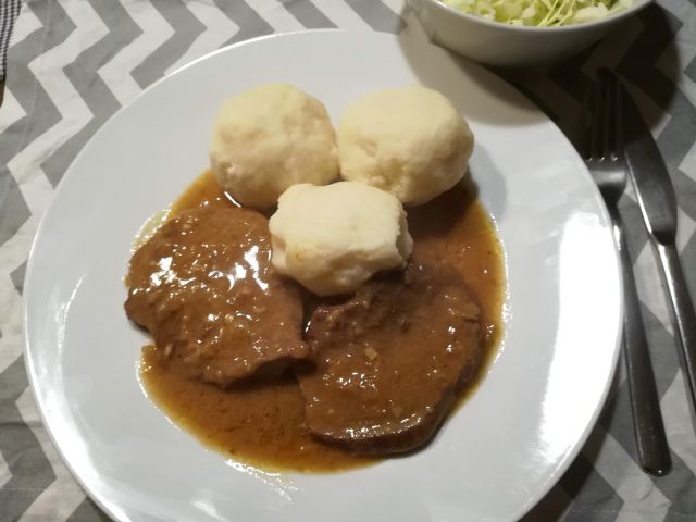 danes goveji zrezki v omaki, zdrobovi cmoki in zeljna solata