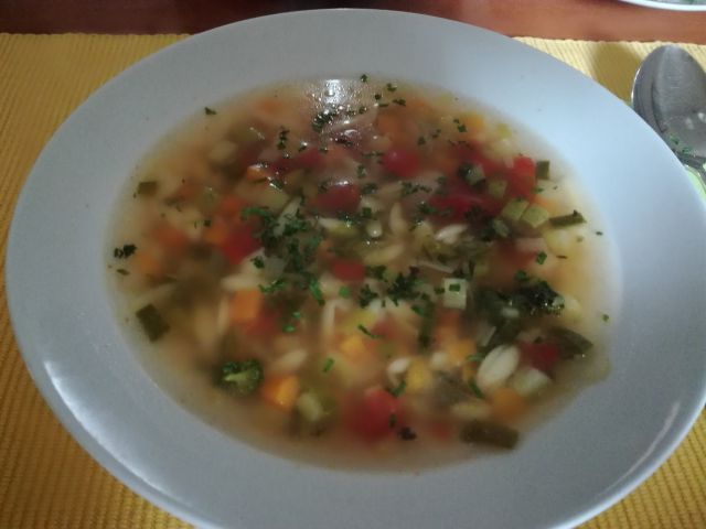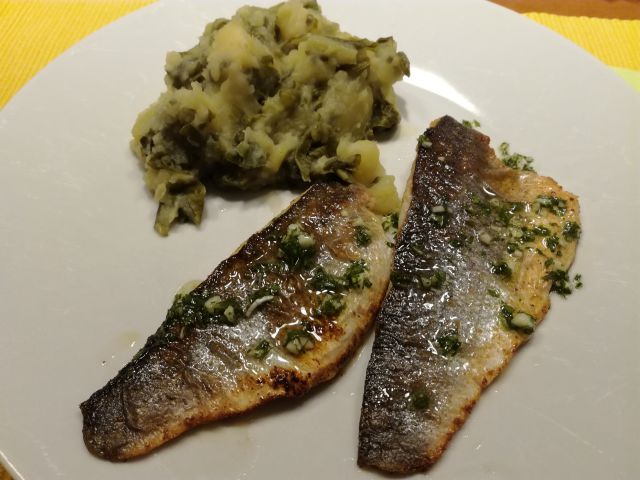 Danes zelenjavna juha, file brancina, blitva s krompirjem, zelena solata kristalka z vrta, za sladico jabolčni zavitek