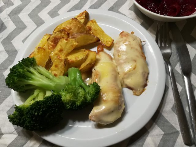 danes piščančji file s sirom, pečen krompir, na pari dušen brokoli, pesa v solati