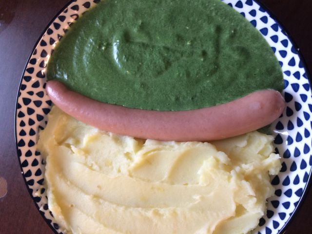 pire krompir, spinaca in hrenovka