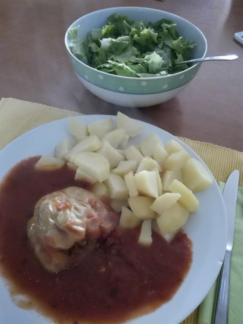 Za moža filana paprika iz zaloge, krompir v kosih, zelena solata