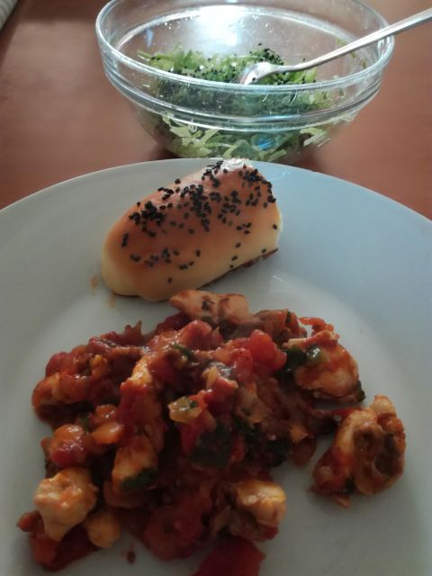 Zame piščančji koščki z dežnikarico, mlado čebulo in paradižnikom, štručka in zeljna solata s črnim sezamom.