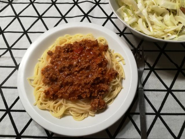 danes in jutri špageti, mesna omaka in zeljna solata