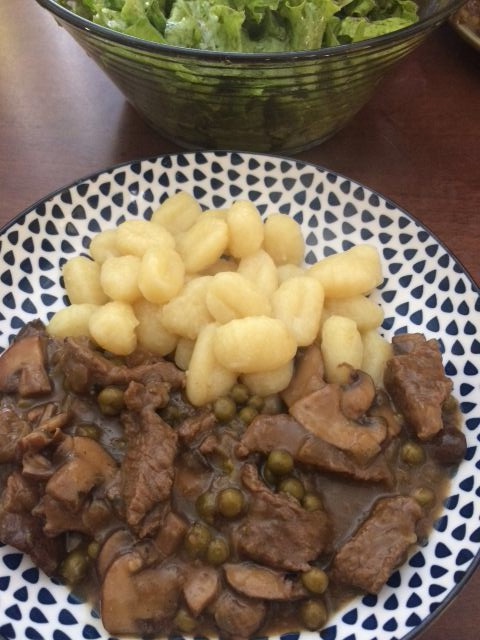 govedina v omaki iz cebule, gob in graha, njoki ter solata