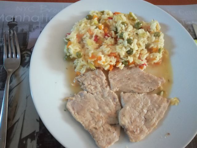 Pri nas zrezki v naravni omaki, dušen zelenjavni riž, zelena solata