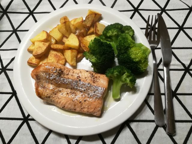 danes popečen lososov file, pečen krompir iz pečice in na pari kuhan brokoli