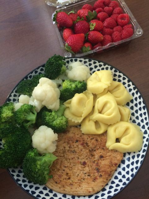 Puranji zrezek, brokoli, cvetaca in tortelini s plavim sirom. Za sladico maline in jagode.