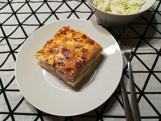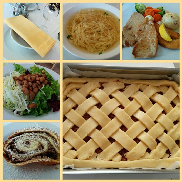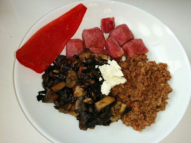 Skuhala sem omako iz govejega mletega mesa z dodano paradižnikovo omako in temnim pivom, njoke z rdečo peso in pražene gobice, goban in črne trobente, namesto solate je bila vložena paprika in koscel feta sira. Sladica bo jabolčna pita