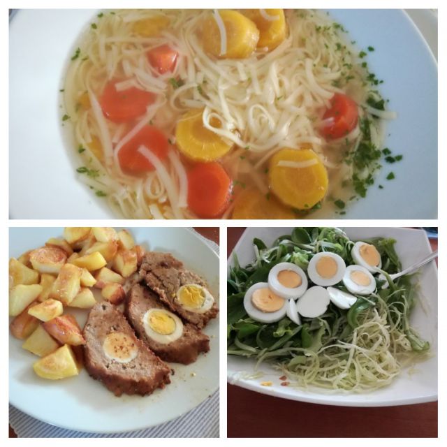 Mi smo včeraj jedli govejo juho z rezanci, pohanega zajčka, pražen krompir in zeljno solato s fižolom. Za posladek je bila orehova in rozinova potica, pa kavica in čvek... ![]()
