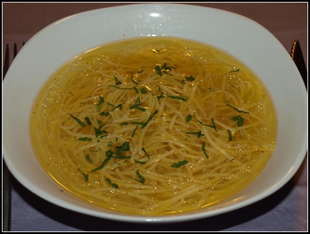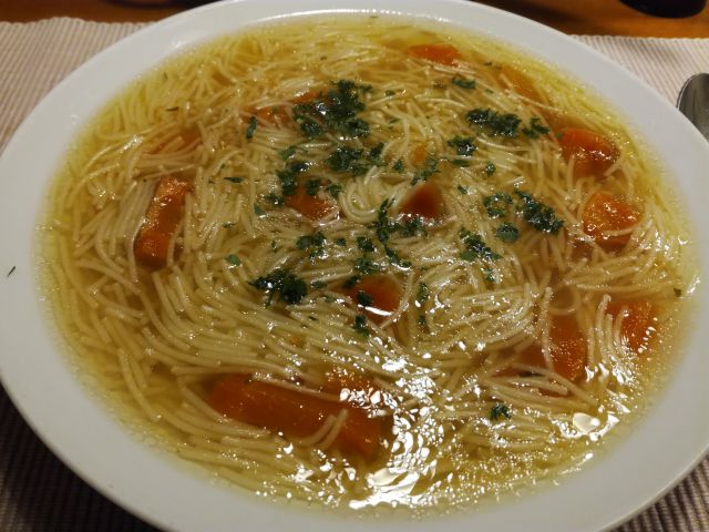 Danes za nas goveja juha z rezanci, ostanki pečenke od včeraj, pirini peresniki, zelena solata.