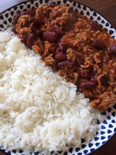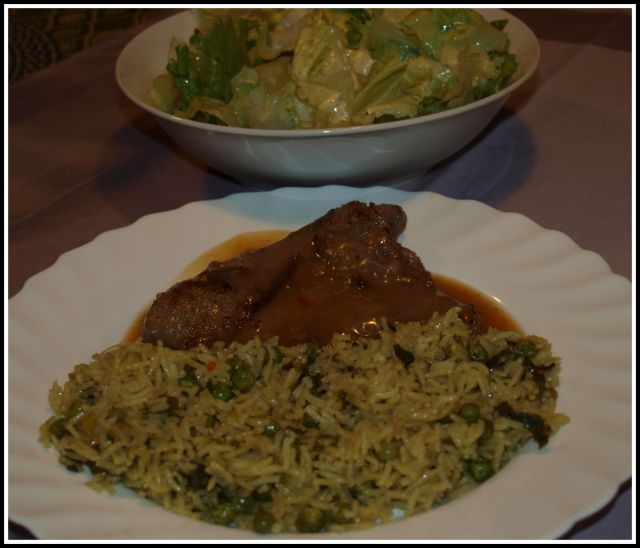 Goveje-kurja juhica (od včeraj), goveji zrezek v omaki, basmati riž na poru in grahu, endivija s krompirjem