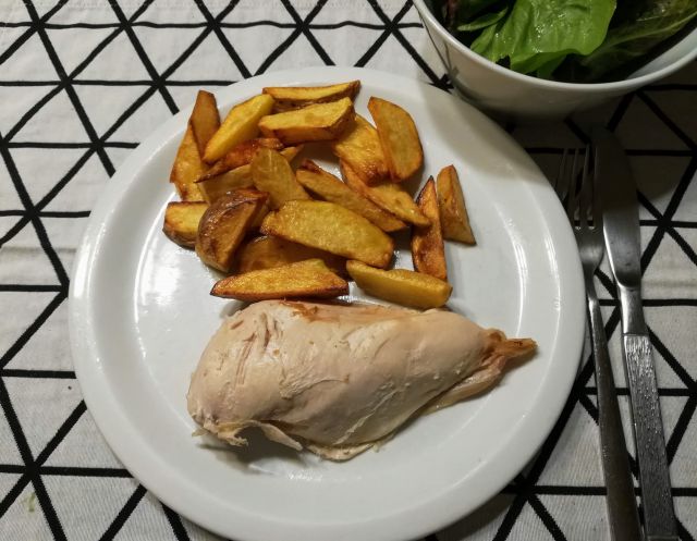 včeraj in danes enako, piščančja juhica, polovica pečenega piščanca, pečen krompir in radič v solati