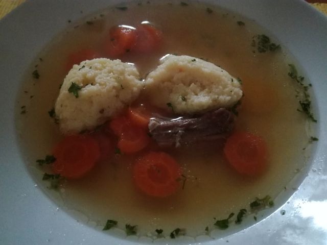 Danes ( goveja juha) za nas tri z zdrobovim cmoki, za moža z rezanci, testenine, paradižnikova omaka, mešana solata