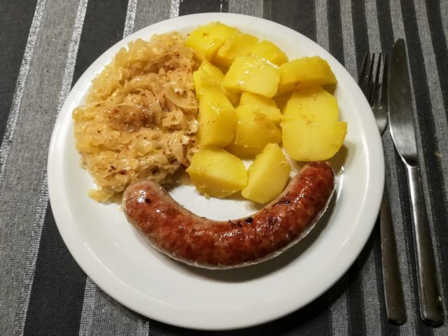 danes pečenica, tenstano kislo zelje in kuhan krompir