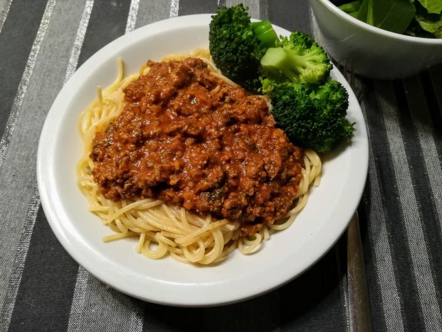 danes in jutri špageti, mesna omaka, na pari kuhan brokoli in radič s špinačo v solati