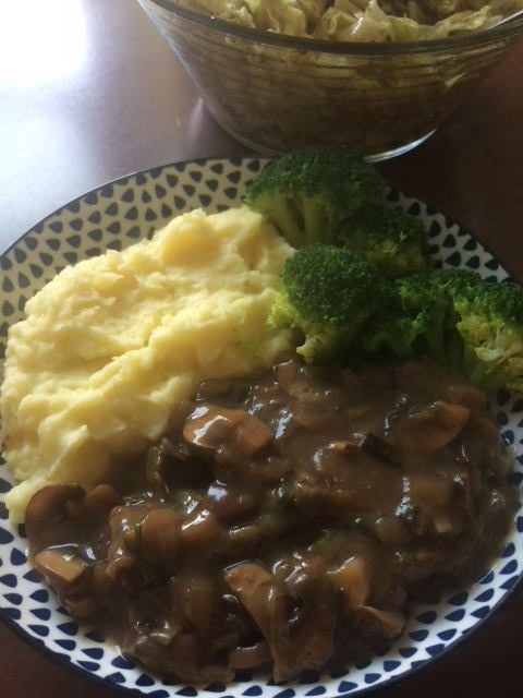 govji zrezki v omaki, pire krompir, brokoli in solata
