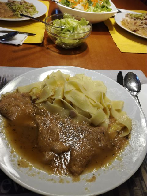 Zrezki v omaki, široki rezanci, mešana solata, torta od včeraj.