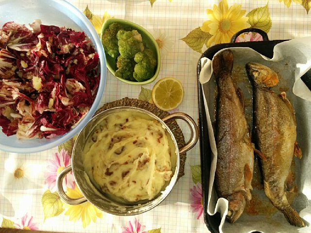 v pečici sem spekla ribe, iz krompirja naredila pire in dodala predhodno na čebuli in česnu prepražene suhe gobe, na hitro skuhala brokoli kot še ena priloga in pa radič v solati z dodanim enim krompirjem, limona pa za pokapljat po ribi.
