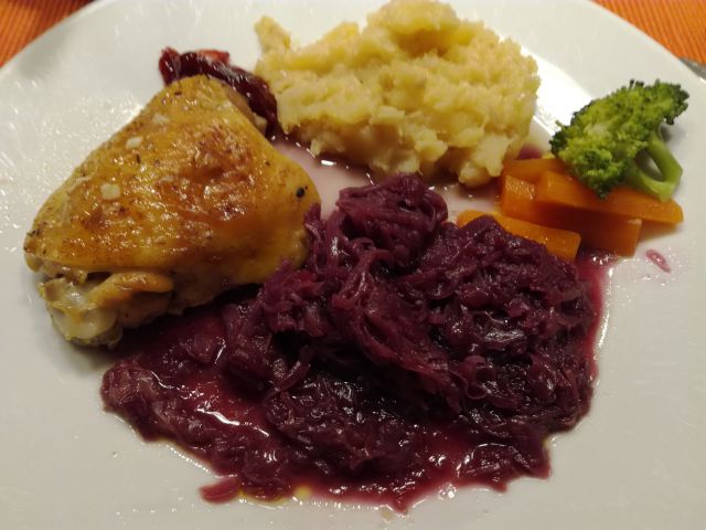 Pri nas včeraj rižota z papriko in paradižnikom, pečen piščanec in rdeča pesa.Danes pa kisla repa z proseno kašo in pirejem iz fižola ter piščanec od včeraj.