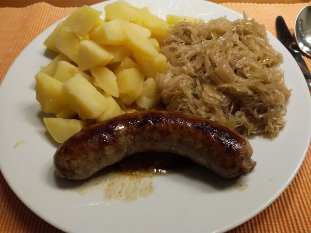 Za moža dušeno kislo zelje, v kosih krompir, pečenica
