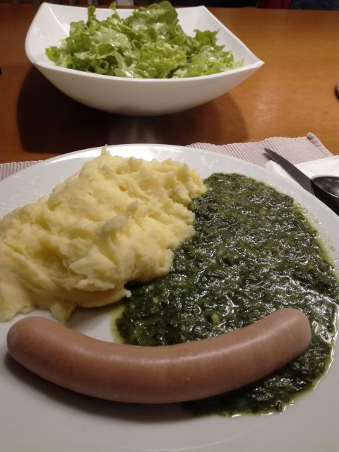 Danes goveja juha z rezanci, špinača, pire krompir, hrenovka, zelena solata