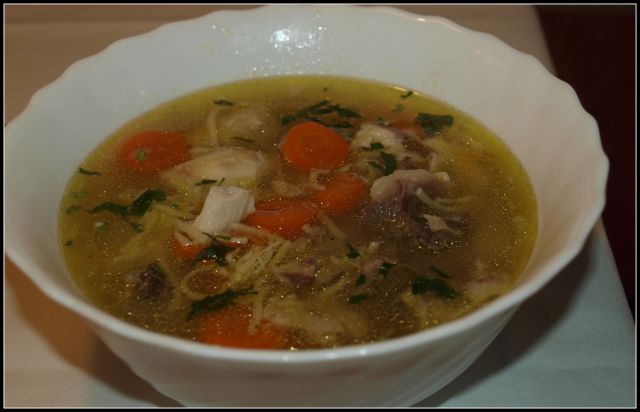 Prežganka z zelenjavo in raznimi začimbami (taka zelooo obogatena, pretežno porovo-peteršiljeva prežganka) v njej pa riževi rezanci (ne vem če so glih riževi ampak uni extra tanki, prozorni rezanci, ki se skuhajo v tak 5 minutah).