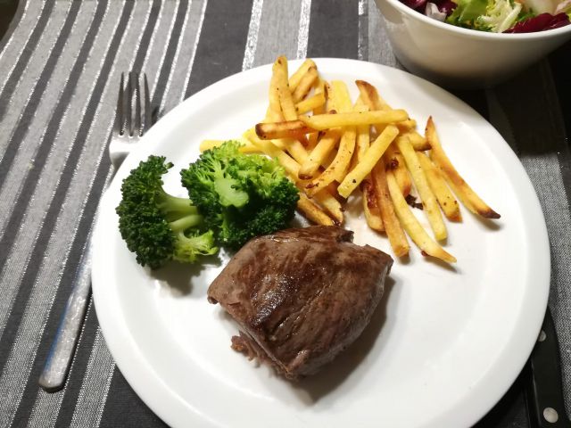včeraj goveji steak, na pari kuhan brokoli, pomfri in mešana solata