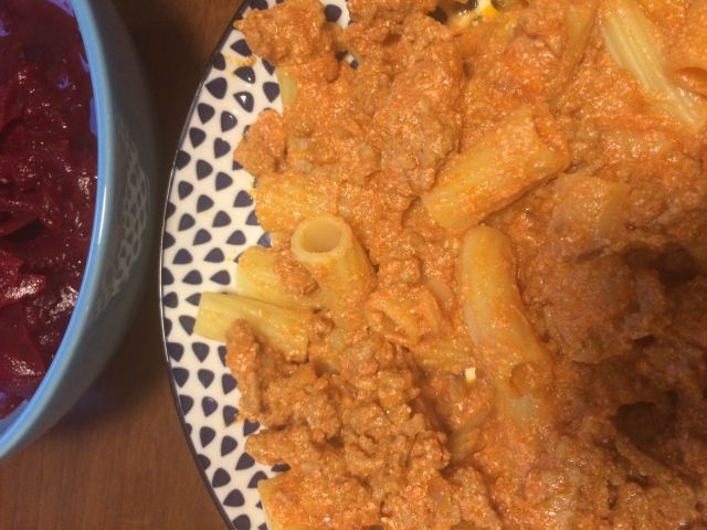 testenine, omaka iz mletega mesa, paradiznika in ricotte ter rdeca pesa