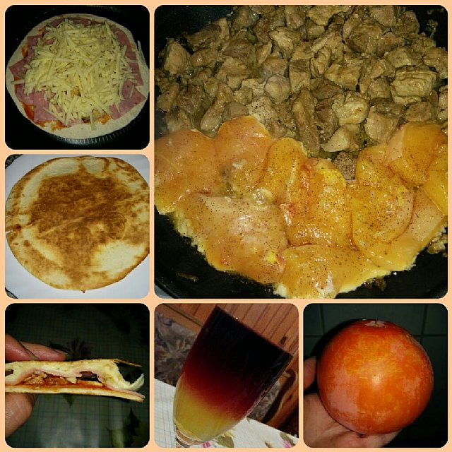 med dvema plastema tortilij ketchap, šunka, sir in na obeh straneh pečeno v ponvi