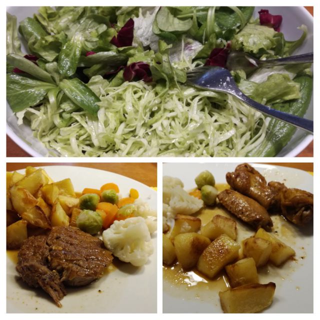 Danes pečeno meso (teletina, piščančji kos prsi, piščančje peruti) pečen krompir, mešana solata